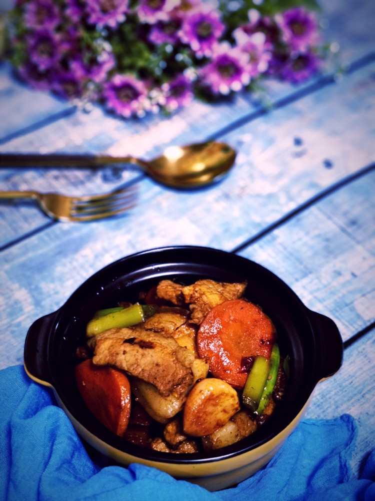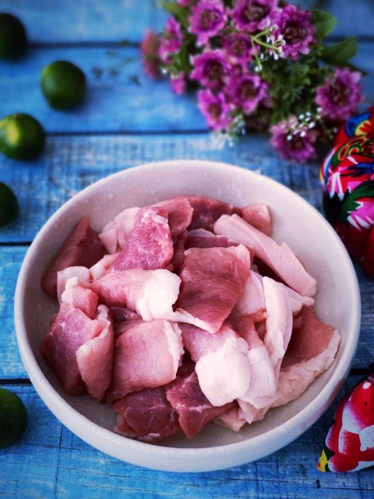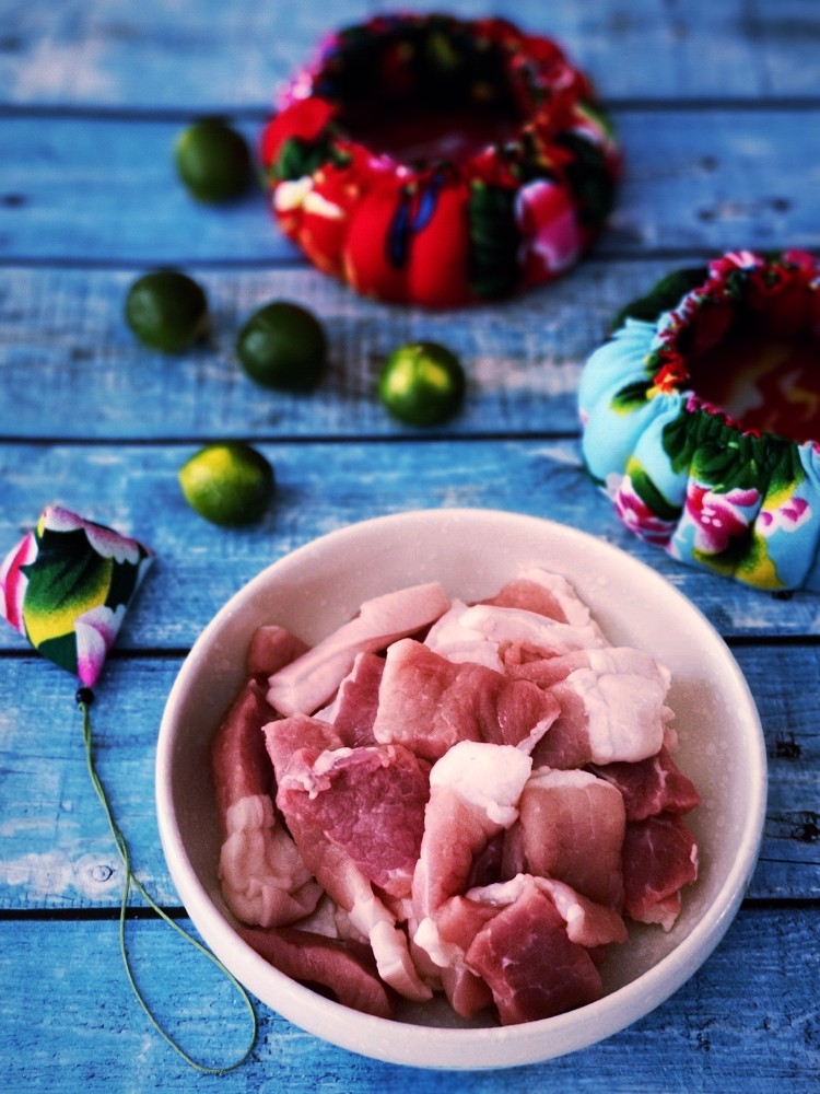 用料食材:(适量) 五花肉 蒜苗 胡萝卜 郫县豆瓣酱 生姜 大蒜 白糖 料酒 生抽 老抽 食盐 鸡精 花椒 青柠檬
