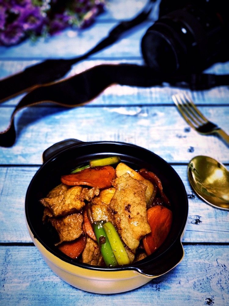 最关键的步骤:炒锅中放入底油,油温七成热后,先放一小勺白糖,再放入十三香(少许),而后放入适量郫县豆瓣酱一起翻炒至香,同时放几粒花椒爆香,继续加入胡萝卜片翻炒,再放入肉片、蒜苗一起炒熟,最后加入各种调味品出锅,记住一定要趁热吃。