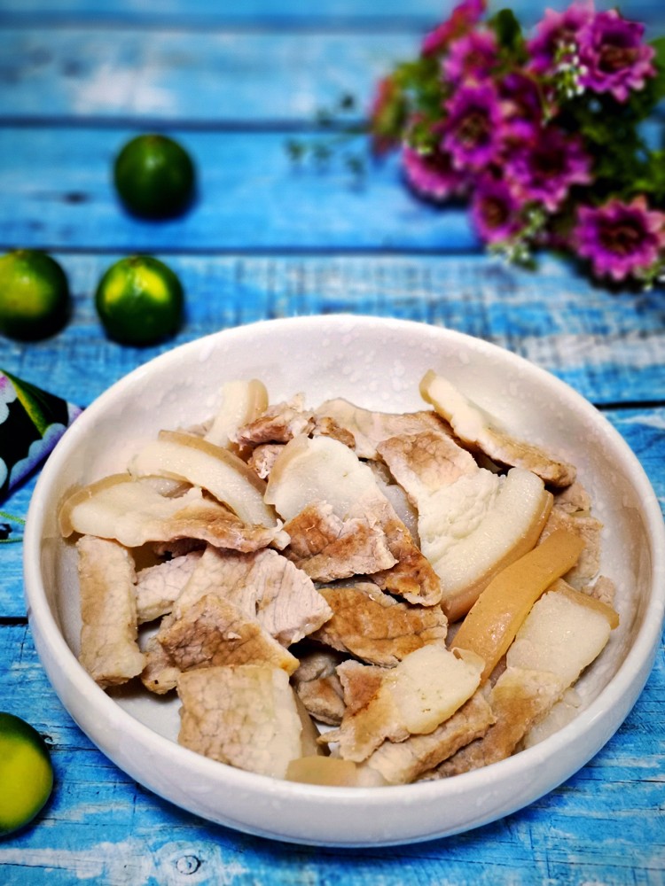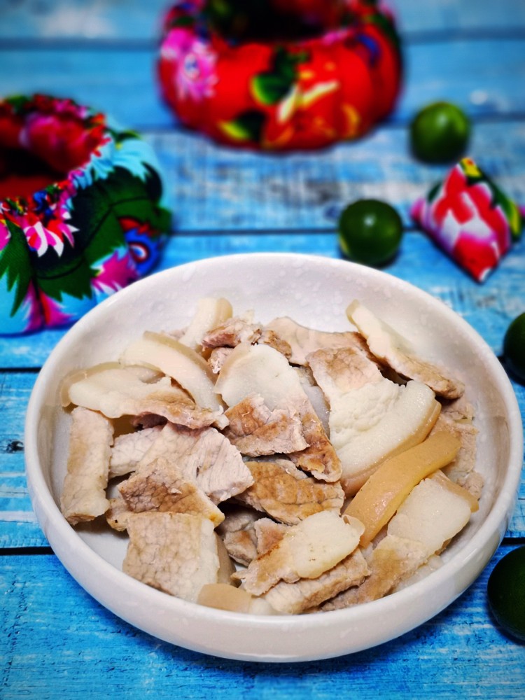 步骤: 1.为了防止油腻,把五花肉先切成片,放入烧开的沸水中煮八成熟,去掉漂浮物。(待用) 2.胡萝卜切片,蒜苗切成小段。 3.我做回锅肉的关键配料,准备好的姜片和大蒜头是自己腌制熟的泡菜,和回锅肉一起翻炒,味道别具一格。